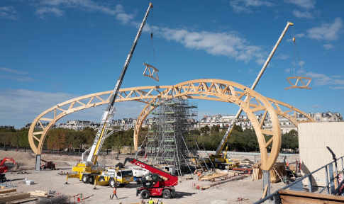 La construcción del Grand Palais Éphémère, auténtica hazaña logística y técnica, duró solo 10 meses entre la instalación de la protección de los monumentos históricos y la apertura al público. Este desafío se superó gracias a nuestro sistema de construcción fuera del lugar. En efecto, la estructura compuesta por 44 arcos de láminas encoladas, que representan un total de 500 toneladas de madera, se prefabricó en el taller y a escala humana, y luego se montó in situ en 3 meses. La elección de los materiales que se utilizaron y el diseño del edificio también contribuyeron en gran medida a reducir el tiempo de ejecución. Los 15 000 m² de membranas que recubren el armazón del Grand Palais Éphémère constan de una tela revestida translúcida en la parte superior de la cubierta y de una membrana ETFE transparente en los laterales, lo que limita el volumen de los materiales y facilita su transporte e instalación. En cuanto a los arcos, desde un principio, se diseñaron como una suma de elementos idénticos para agilizar y simplificar su fabricación en el taller y su montaje en la obra.